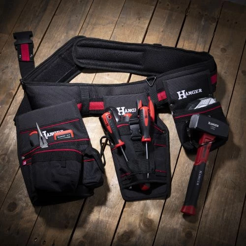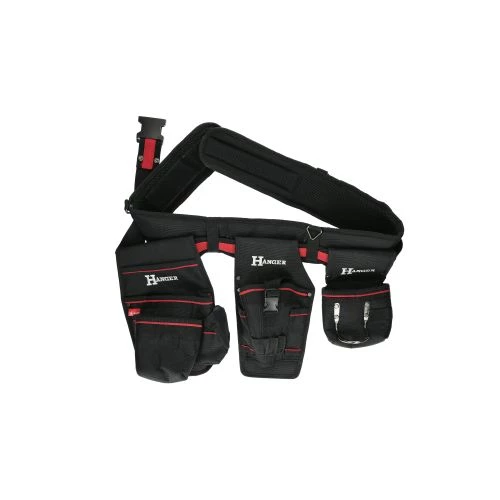 Ceinture porte outils polyestère. Doublage de la ceinture au niveau du dos. 16 poches de rangement. 1 porte marteau.