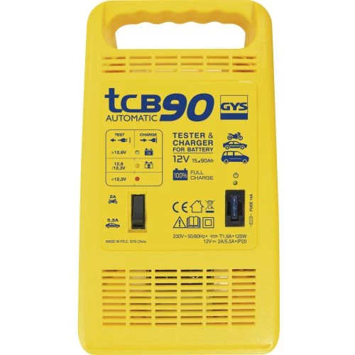 Le chargeur GYS TCB90 automatic 12 V + testeur batterie est conçu pour les batteries moto, VL essence ou diesel de 15 à 90Ah. Il recharge à 100% à l’aide du système Floating Process (Profil de charge WU). Et en cas d’inversion de polarité, il est muni d’une alarme sonore ; d’ailleurs inutile de débrancher la batterie du véhicule pendant la charge.Ce chargeur est équipé de protections diverses, de logements pour câbles, et des pinces de charge isolées.