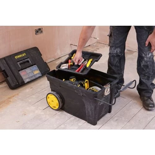 Le coffre de chantier Contractor de la marque Stanley est un organiseur amovible avec compartiments dont deux tiers du plateau amovible sont dédiés au rangement d’outils larges ou longs. Ce coffre dispose d’un couvercle avec rainure en V pour coupe d’appoint.