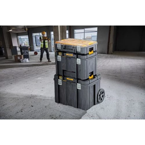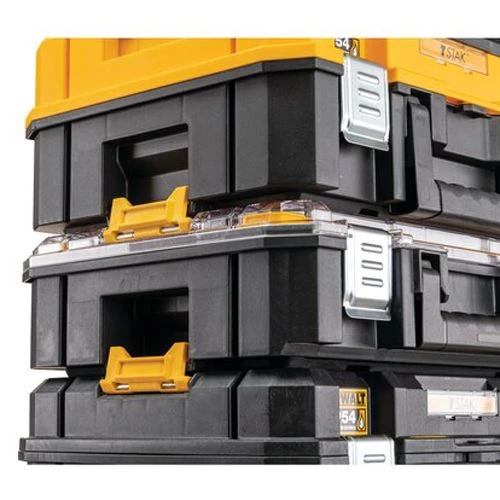 Le système T-STAK IP54 de la marque Dewalt couvreles besoins des chantiers de tous les jours. Cette possibilité de combiner des caissons selon les besoins se traduit par un empilement, un stockage et un transport faciles et rapides des outils sur et entre les chantiers.