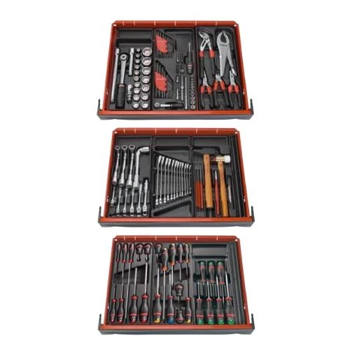 - Sélection de 136 outils avec système de rangement de 9 modules pour 3 tiroirs