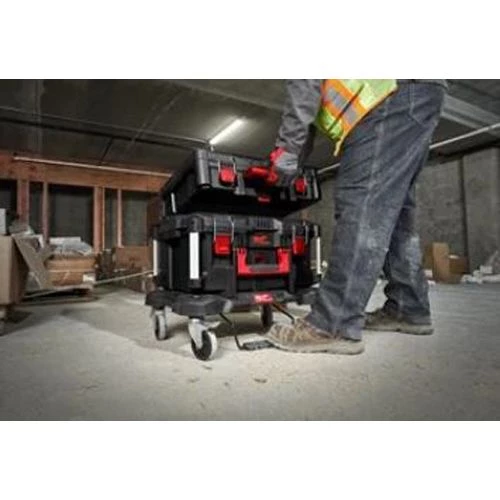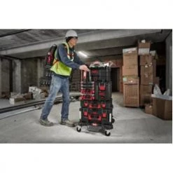 Le trolley plat PACKOUT de la marque Milwaukee dispose d’un frein et deux blocages sur les roues pour bloquer le trolley et connecter des coffrets et sacs PACKOUT™. Ce trolley fait partie du système de stockage modulaire PACKOUT™.